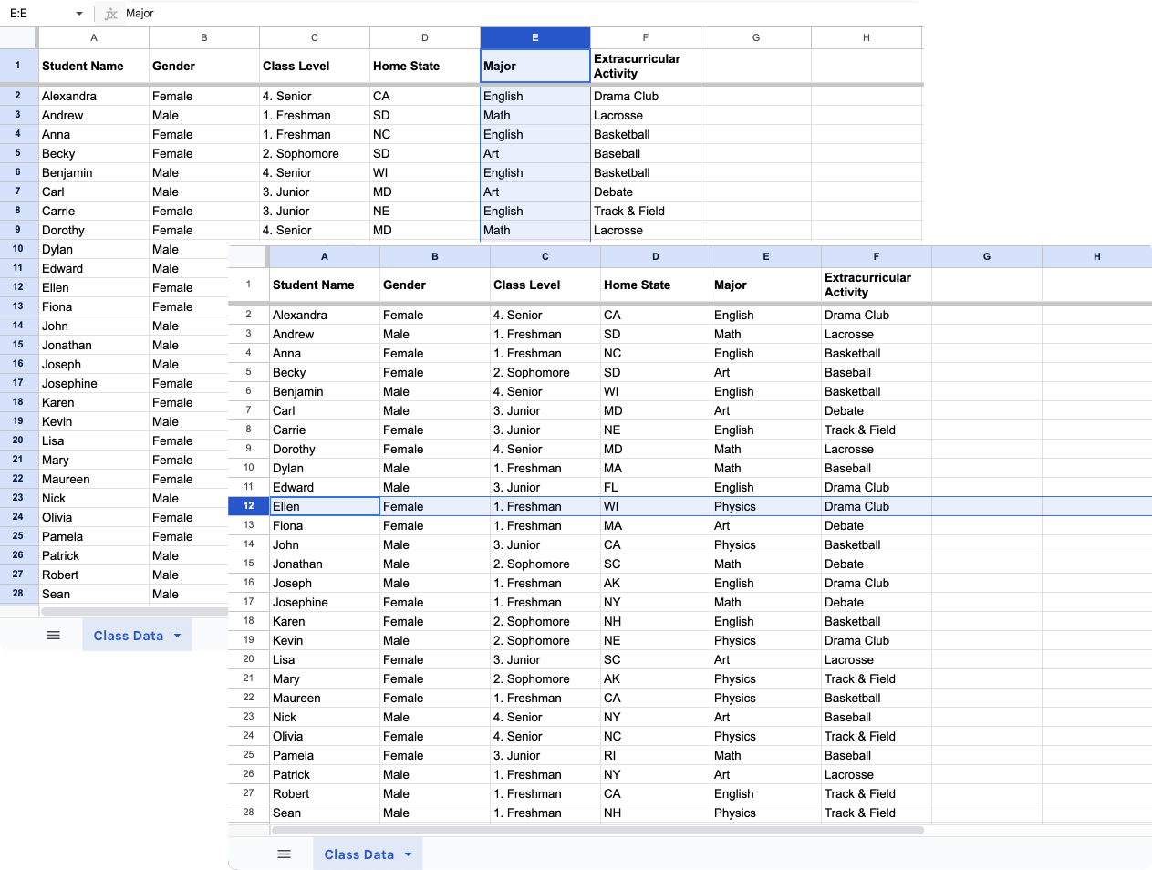 Let's look at the above example, if you are making a list of students in a class, you might have a table for the *Class Data.* In the *Class Data* table, you would have columns for Student Name, Gender, Class Level, Home State, Major, and Extracurricular activity. Note that these names are in the first row, and are unique.