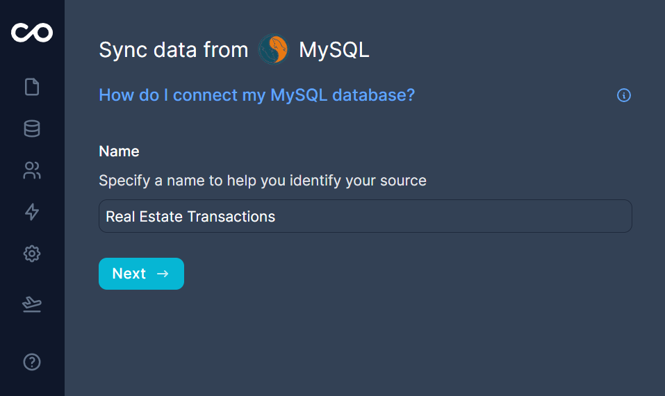 1. **Add your MySQL data source** Navigate to the data tab in your Noloco app and click to add a new data source. From the list, choose MySQL or click this link to be taken to the setup: <https://portals.noloco.io/~/_/setup/mysql>