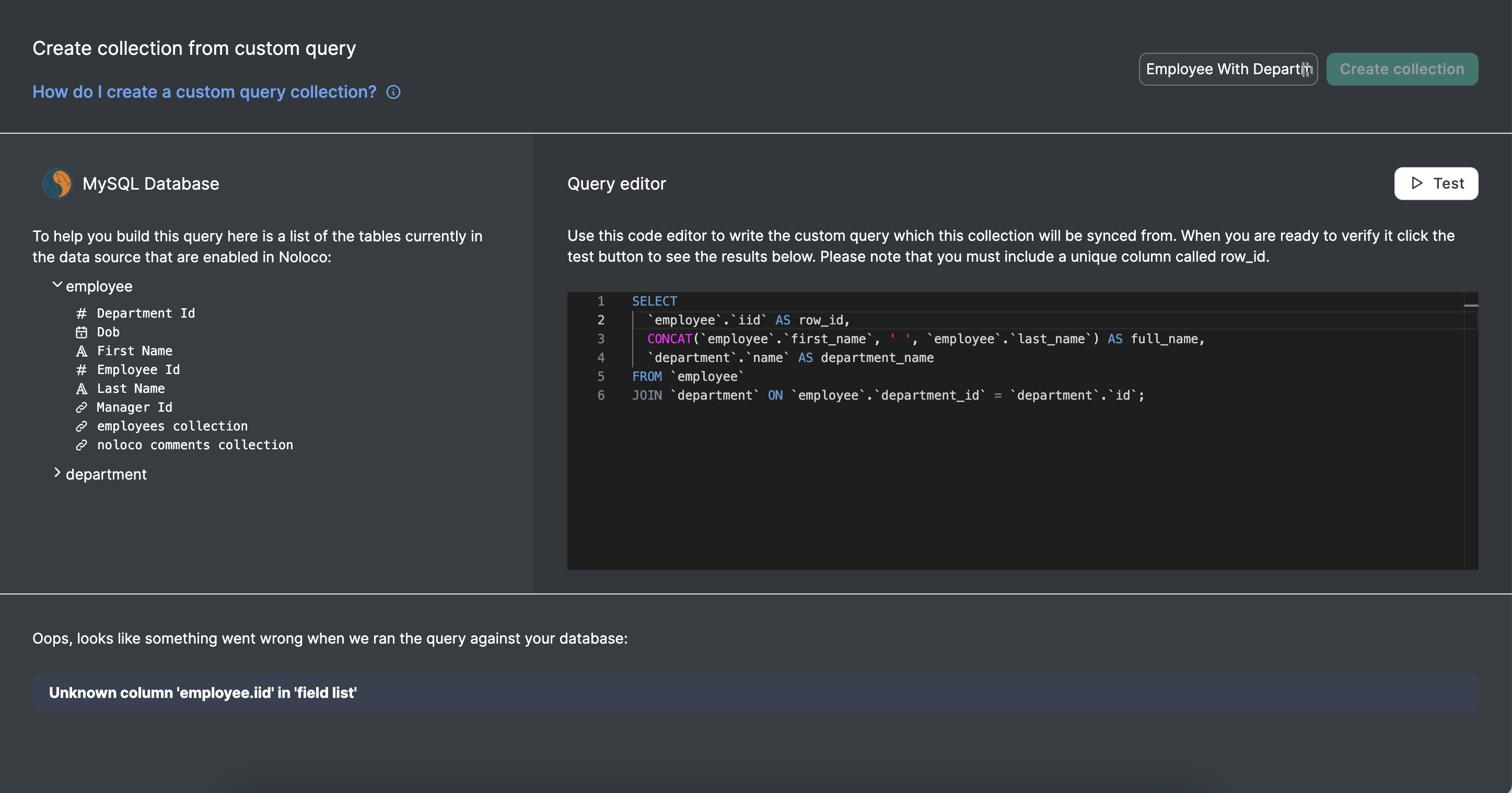 In some cases importing the exact tables that exist on your MySQL database might not be as useful to you as importing the results of a query that curates your data in a certain way. Noloco supports creating a table from a query by opening up the menu for your data source: