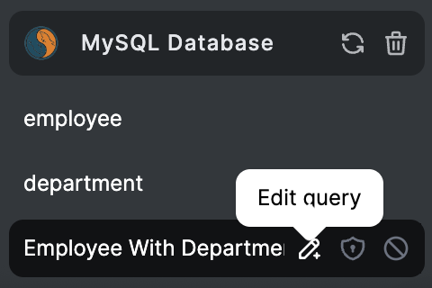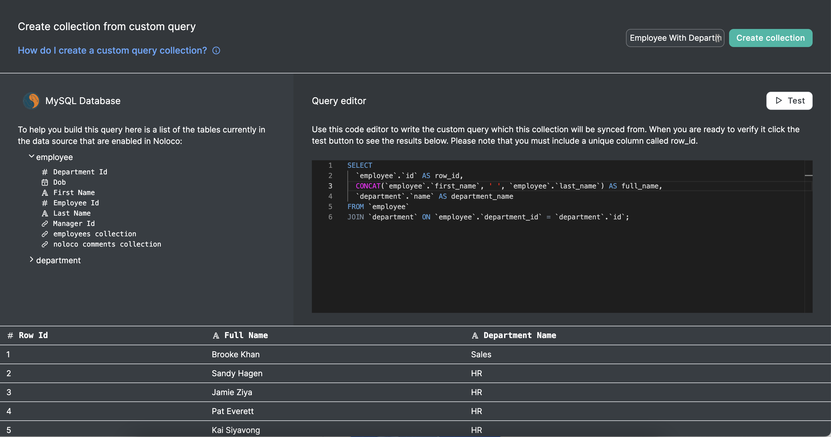After saving the query you will be able to see and use it like any other data type in Noloco. It will also be kept in sync with the upstream database both in schema and in data. If you want to edit the query at any time you can do so by clicking on the edit button from the data table.