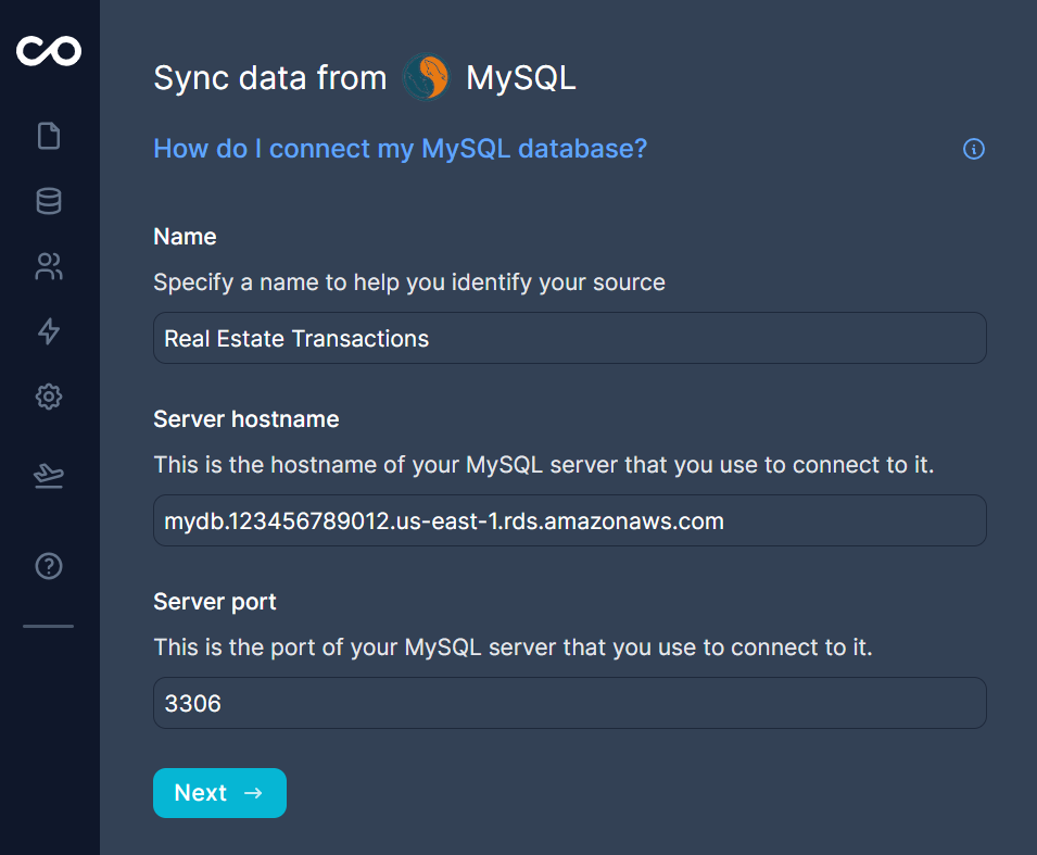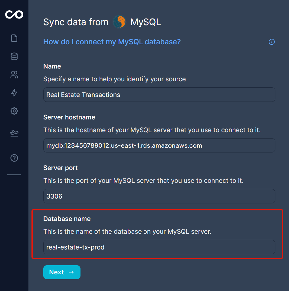 4\. **Enter the database information** We need the name of the database on the server that you want us to connect to. The database will be something that you named.