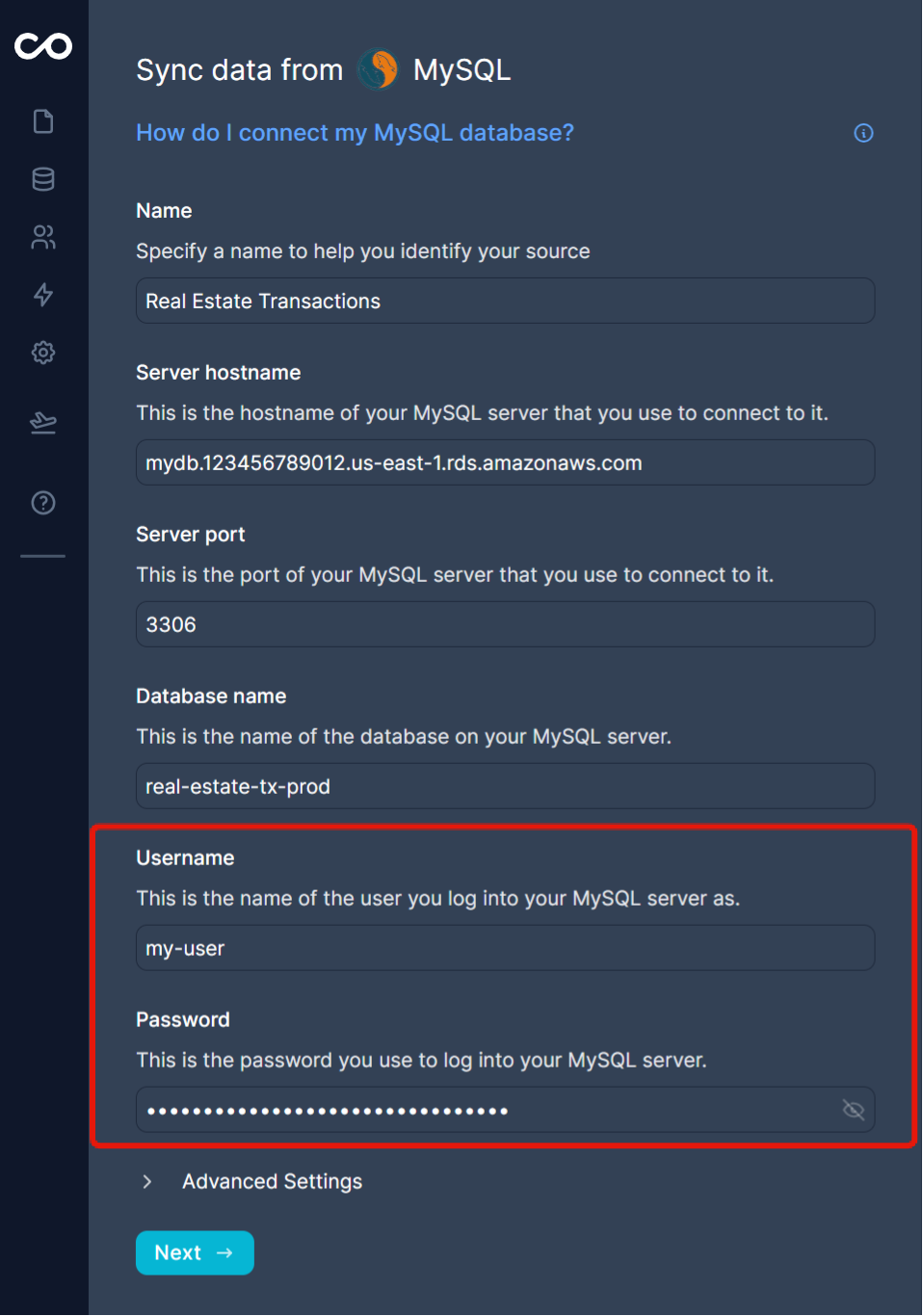 5\. **Enter the login details** You will need to provide a MySQL user's login details for us to use. Specifically we need the username and password for a user with `SELECT`, `INSERT`, `UPDATE` and `DELETE` permissions for tables within the database you are importing to Noloco.