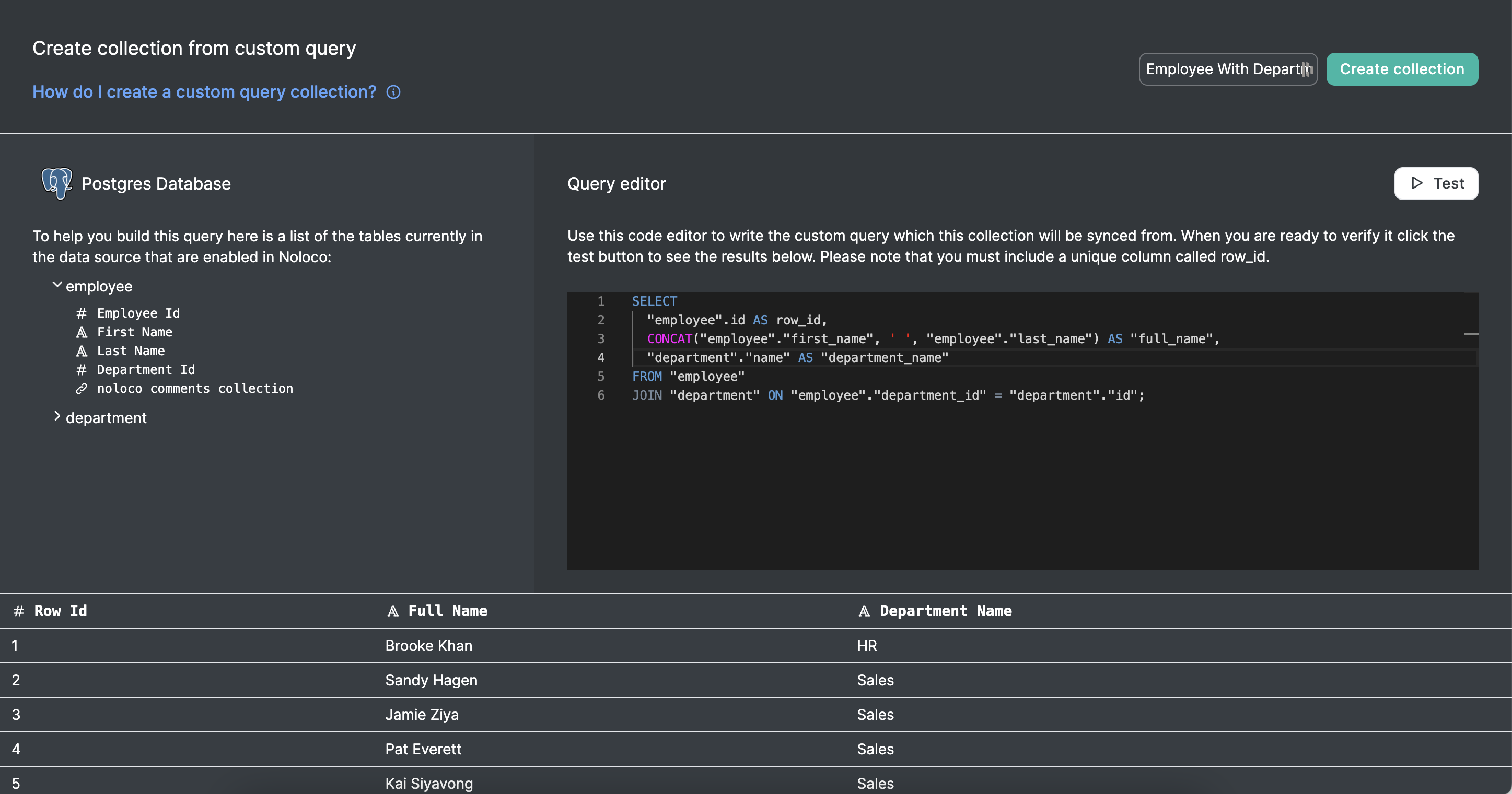 You can add a query table to your app, which creates a new table in your data source, from a custom SQL query. This table will sync with your database, **but will be read-only from Noloco.**