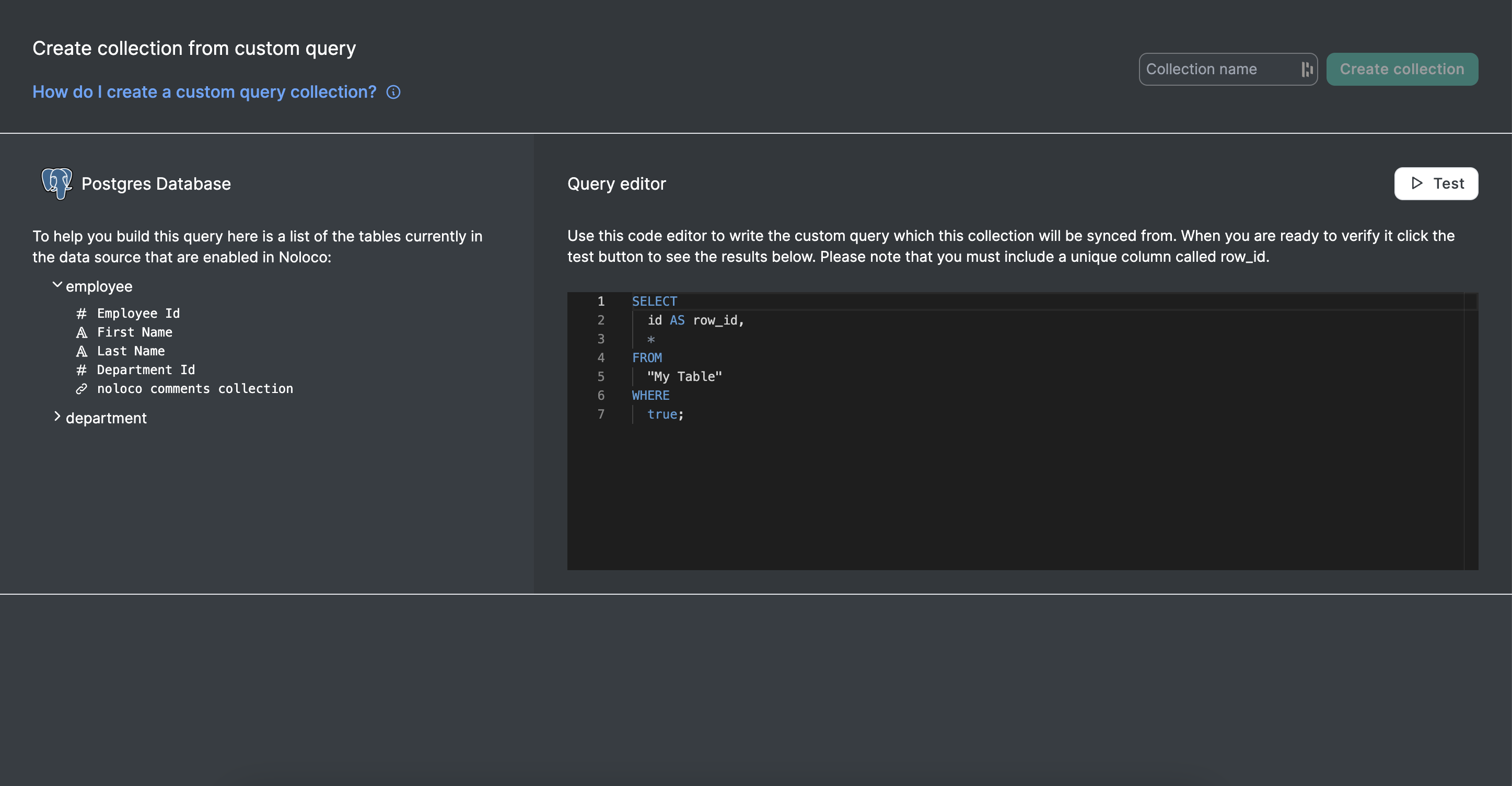At the top of this page is an input for you to name your table. On the left you can see an overview of this data source from Noloco and on the right is a query editor for you to develop and test your query over time. The results of testing your query will appear in the section at the bottom of the page. To save your query you must have a successful test of it.