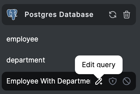 After saving the query you will be able to see and use it like any other data type in Noloco, **except it will be read-only**. It will also be kept in sync with the upstream database both in schema and in data. If you want to edit the query at any time you can do so by clicking on the edit button from the data table.