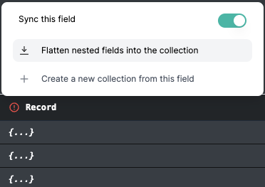Note that we will only show you top-level fields in this table, if the record has nested objects inside it you will need to click on the flatten button in the popover to show child fields. These will then spread into the table and you can disable any that you do not wish to include.