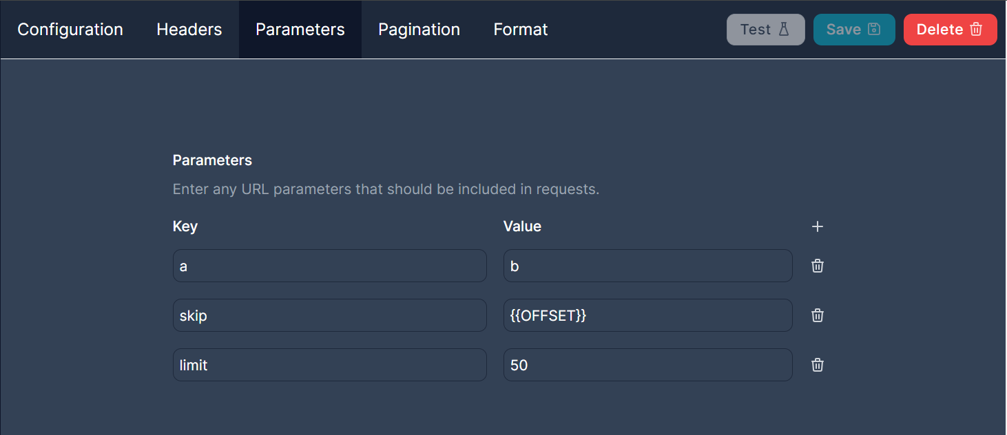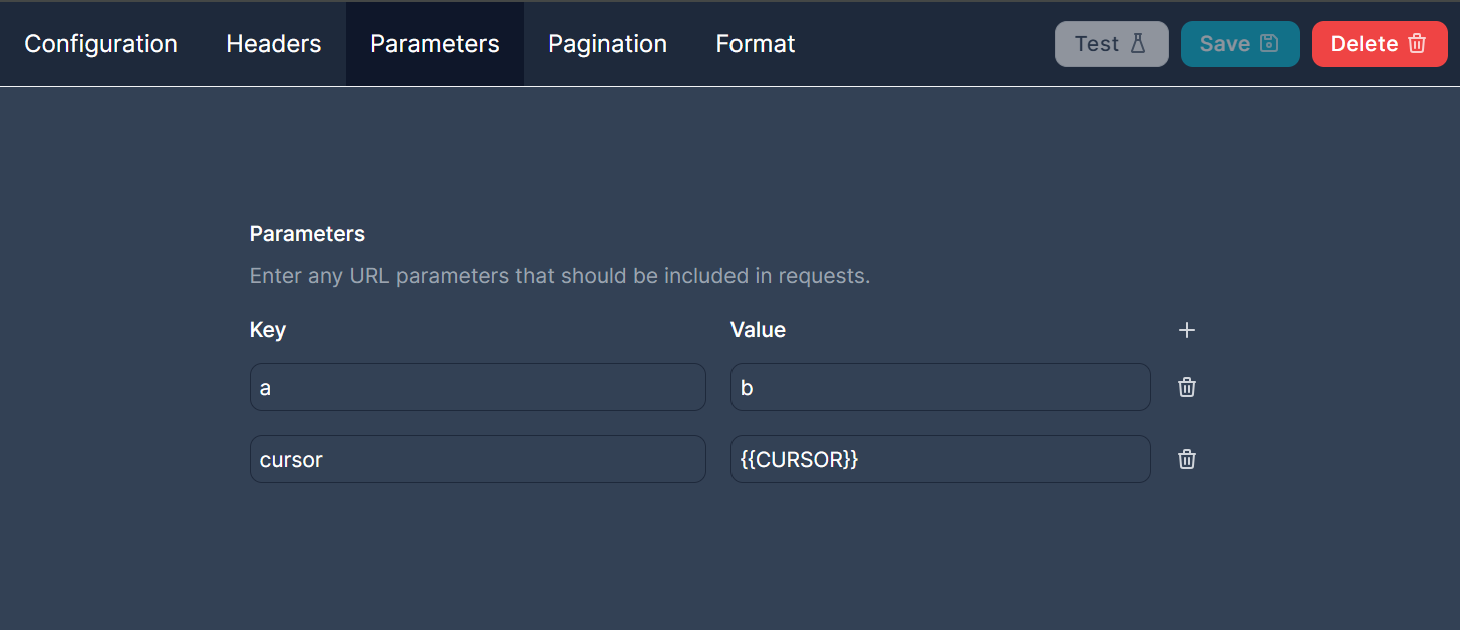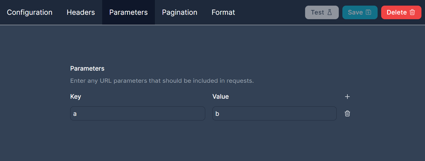 The parameters tab lets you configure query parameters to be put in the URL query string when we make requests. For example if you add a parameter with key `a` and value `b` to the example endpoint we have been using, we would make a request to `https://api.example.com/v1/my/data?a=b`.