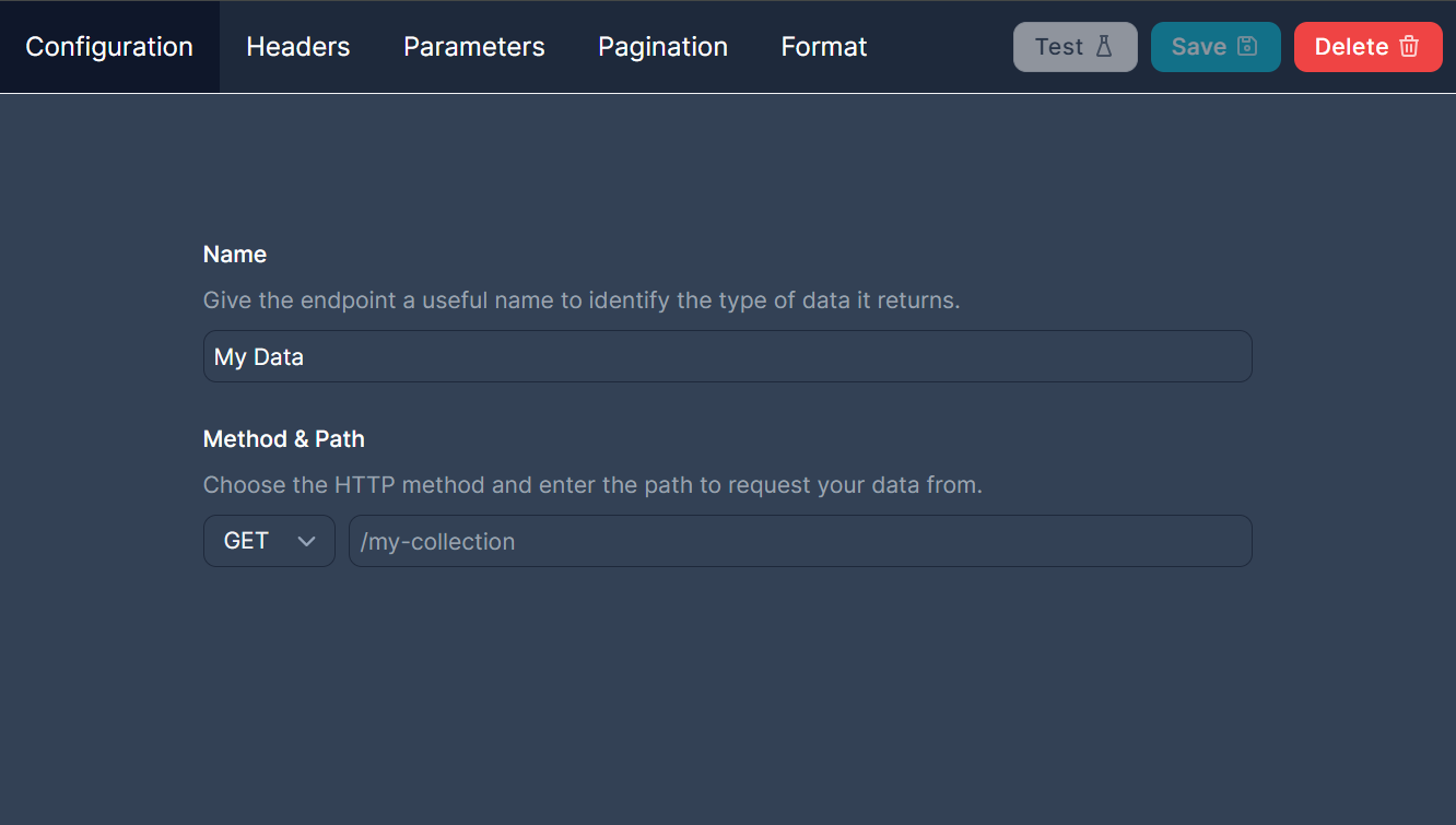 After this we need to know where the endpoint is. You tell us this by giving us the endpoint's path. This is the relative path under the API's base URL. For example if you want to query `https://api.example.com/v1/my/data` and you set the API base URL as `https://api.example.com/v1`, you would set the endpoint's path as `/my/data`. Please note that because we concatenate the base URL with the endpoint's path it is important that either the base URL ends with a `/` or the path begins with one, otherwise it is quite likely that we will be querying the wrong URL.