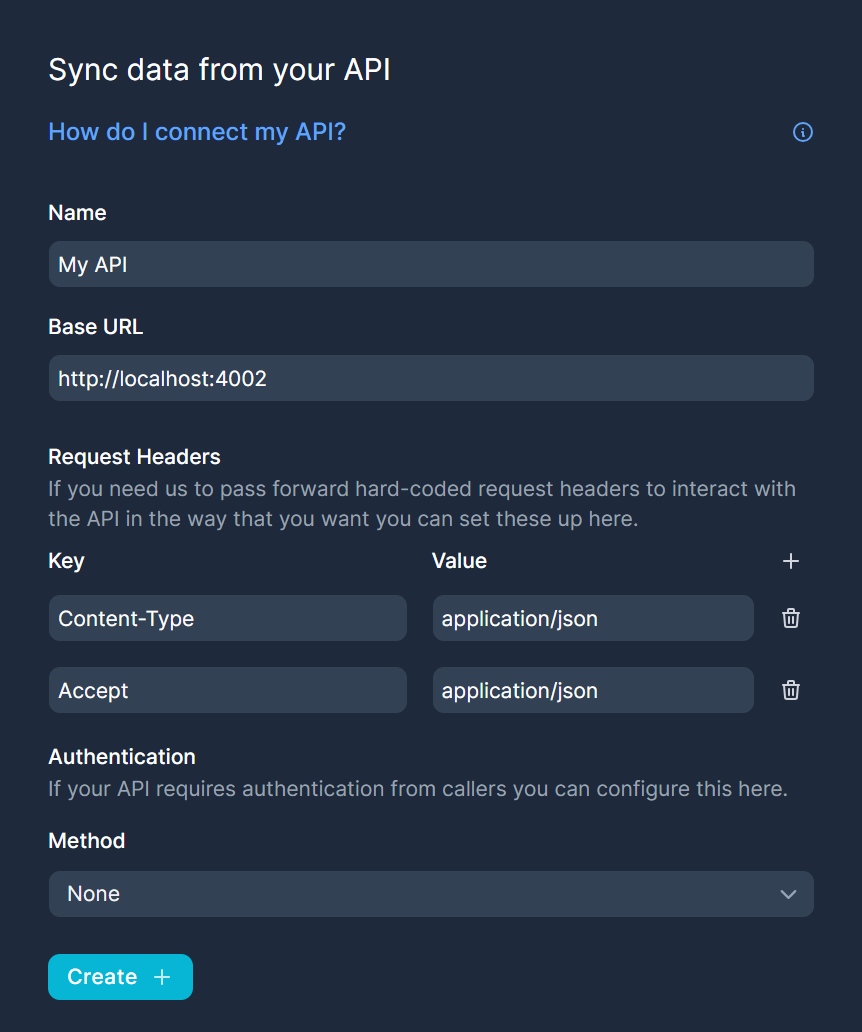 To setup an API table, you will first setup the base API with its URL and any necessary headers/authentication to connect to it. After this, you can add `GET` and `POST` endpoints, each of which will become a Noloco table.