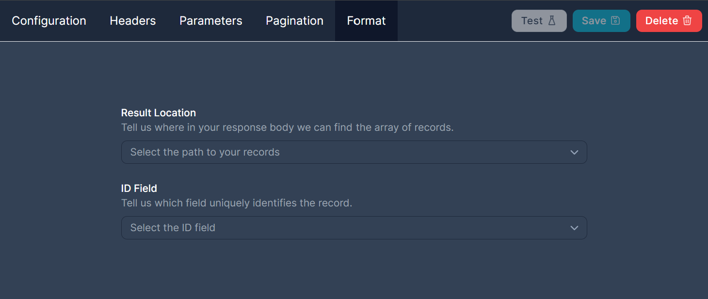 The format tab lets you tell us about the structure of responses you get back from the API. There are two main things you can configure here: