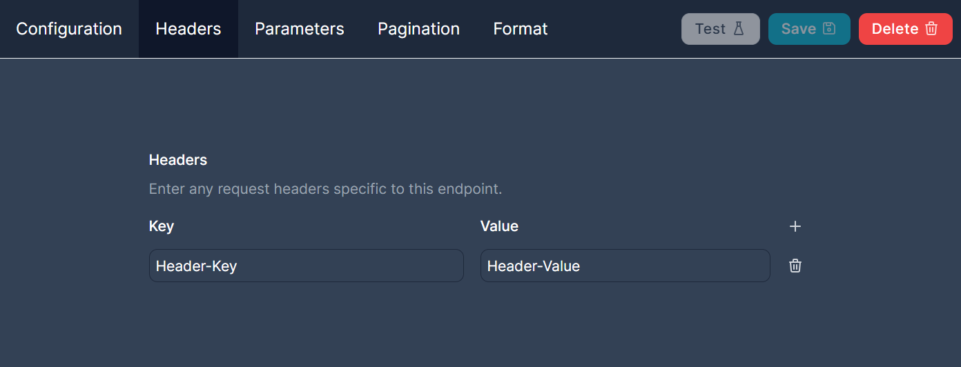 The headers tab lets you configure any additional headers that are specific to the endpoint. Like the API headers these will be encrypted on save. You do not need to redefine any headers you already set at the API level, we will combine the API headers with the endpoint headers when we make requests. For most endpoints you likely won't use this tab as the global API headers are probably all you need.