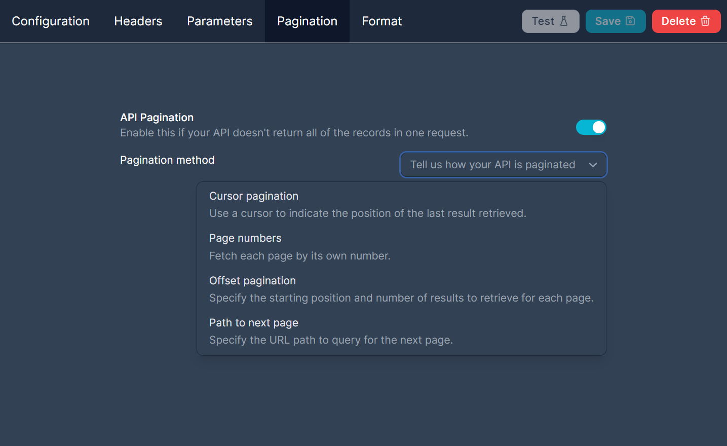 Most API endpoints will not return all of their data in one response, instead they normally return pages of data and someone using them needs to request the pages until they have all been exhausted. If this is the case for your API you can enable pagination on its dedicated tab. After you have enabled it you need to tell us what method your API uses to paginate data. Right now we support three different methods: