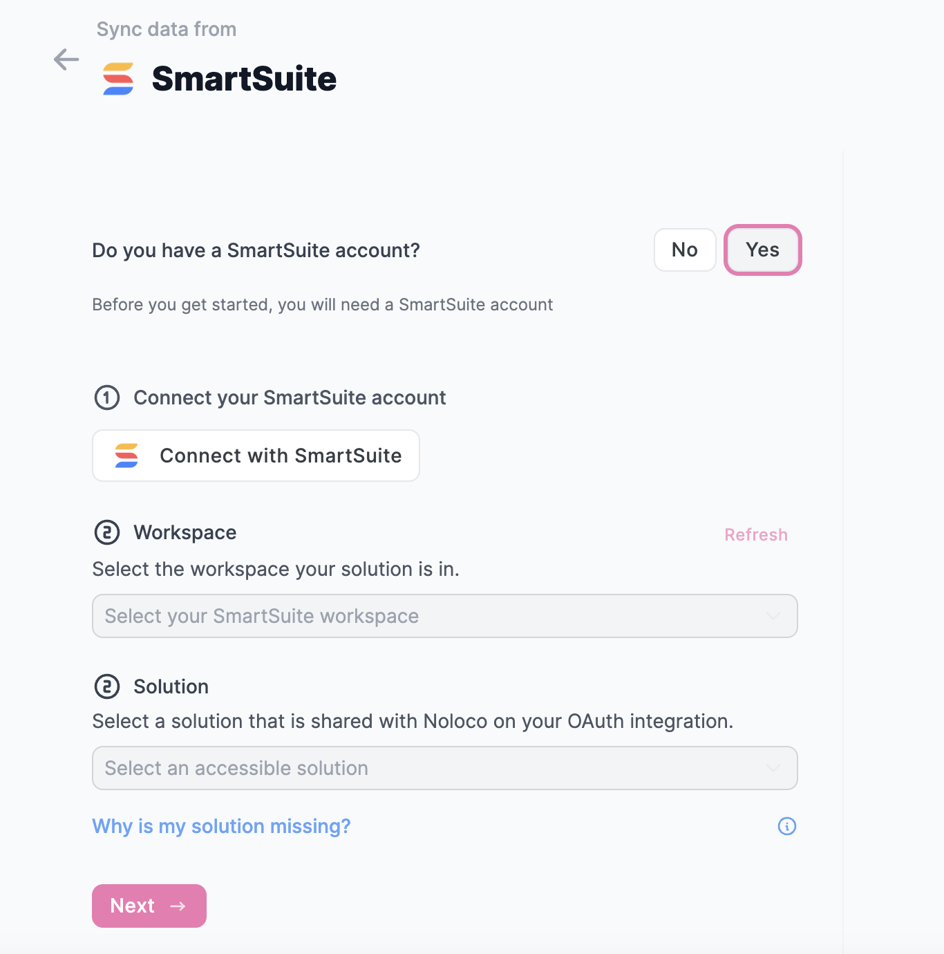 3. **Select your Workspace and then choose a SmartSuite Solution** Choose the SmartSuite workspace that your Solution is in, and then choose the Solution you want to sync to Noloco.