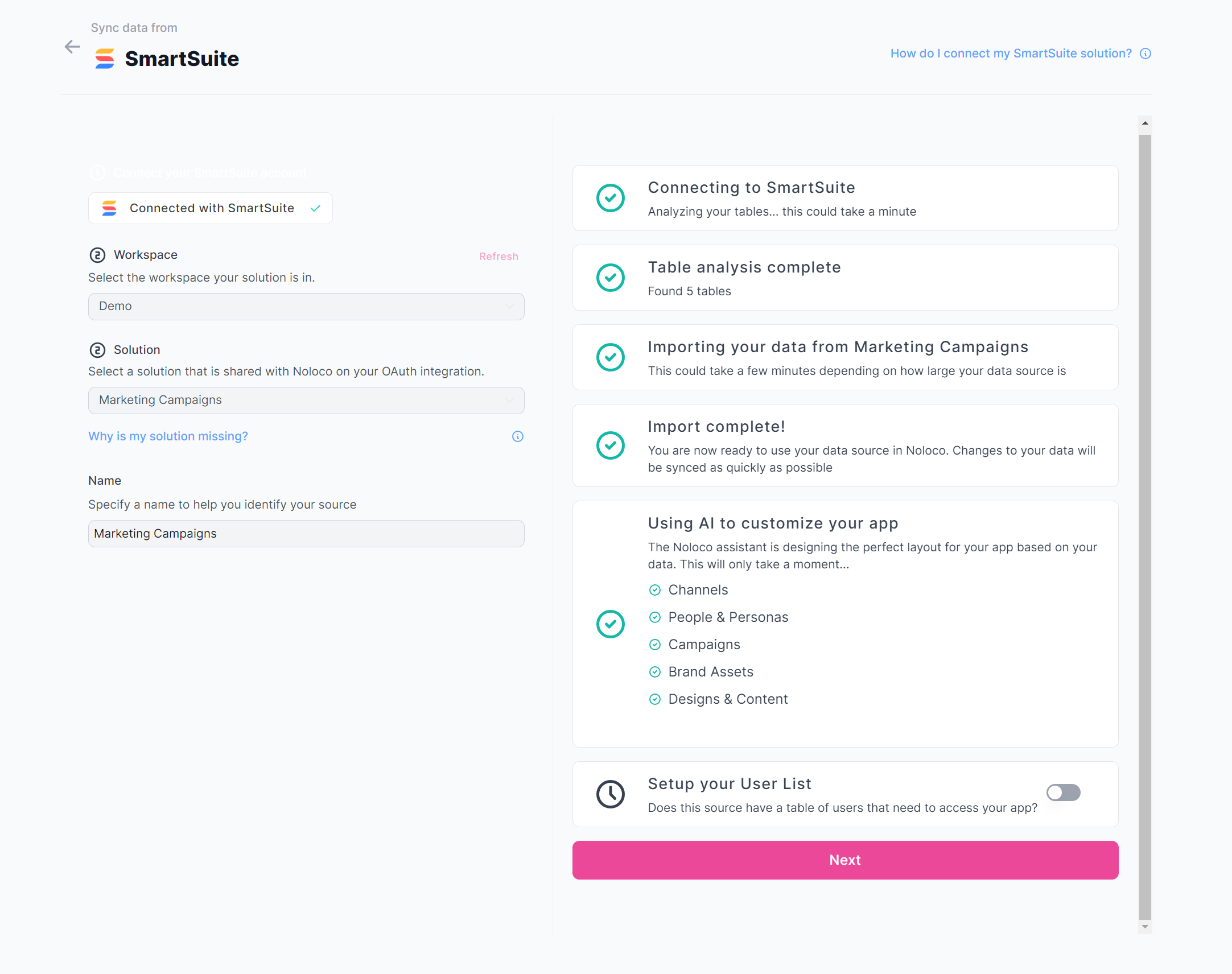 If you're storing data in [SmartSuite](https://smartsuite.com), you can easily connect your SmartSuite solutions(s) to your Noloco apps and allow your team or customers to read, update and create records in SmartSuite directly from your Noloco app.