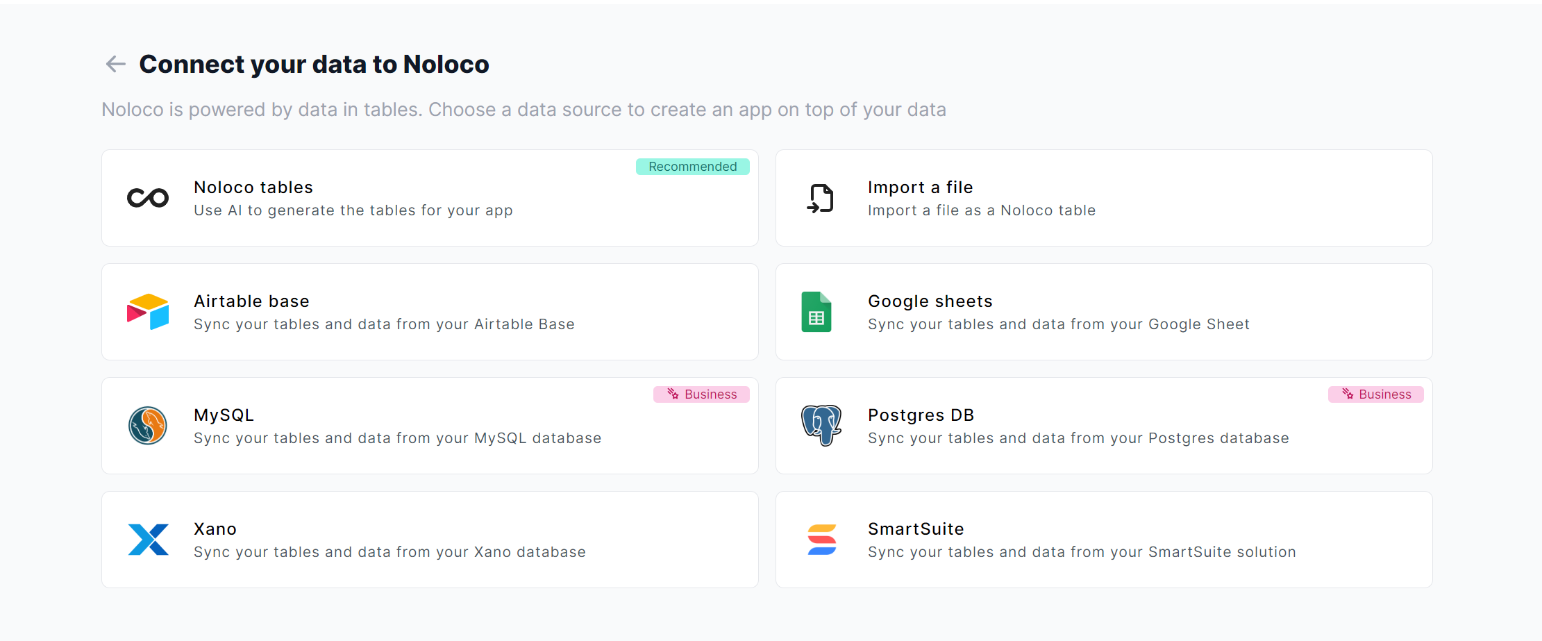 1. **Start the connect flow when creating a new app** When choosing a data source, choose the SmartSuite to sync your tables and data from your SmartSuite solution