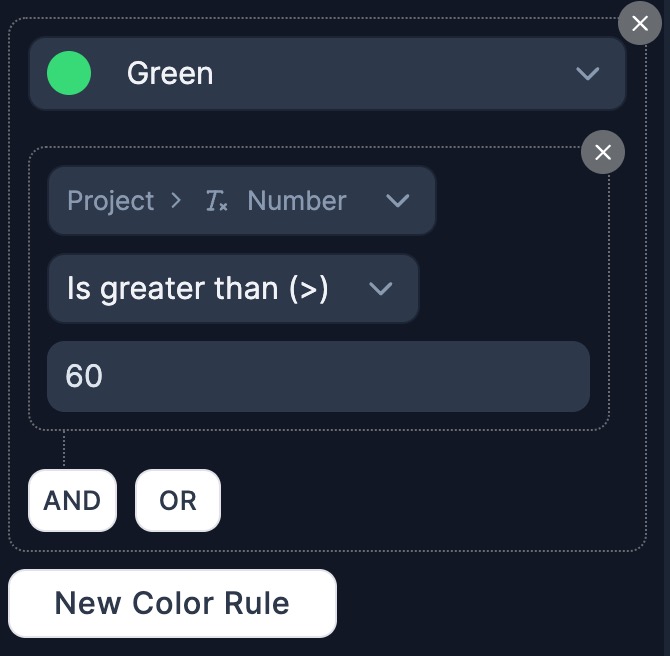 Finally, it will be "Green", if the value of the field *is greater than* 60.