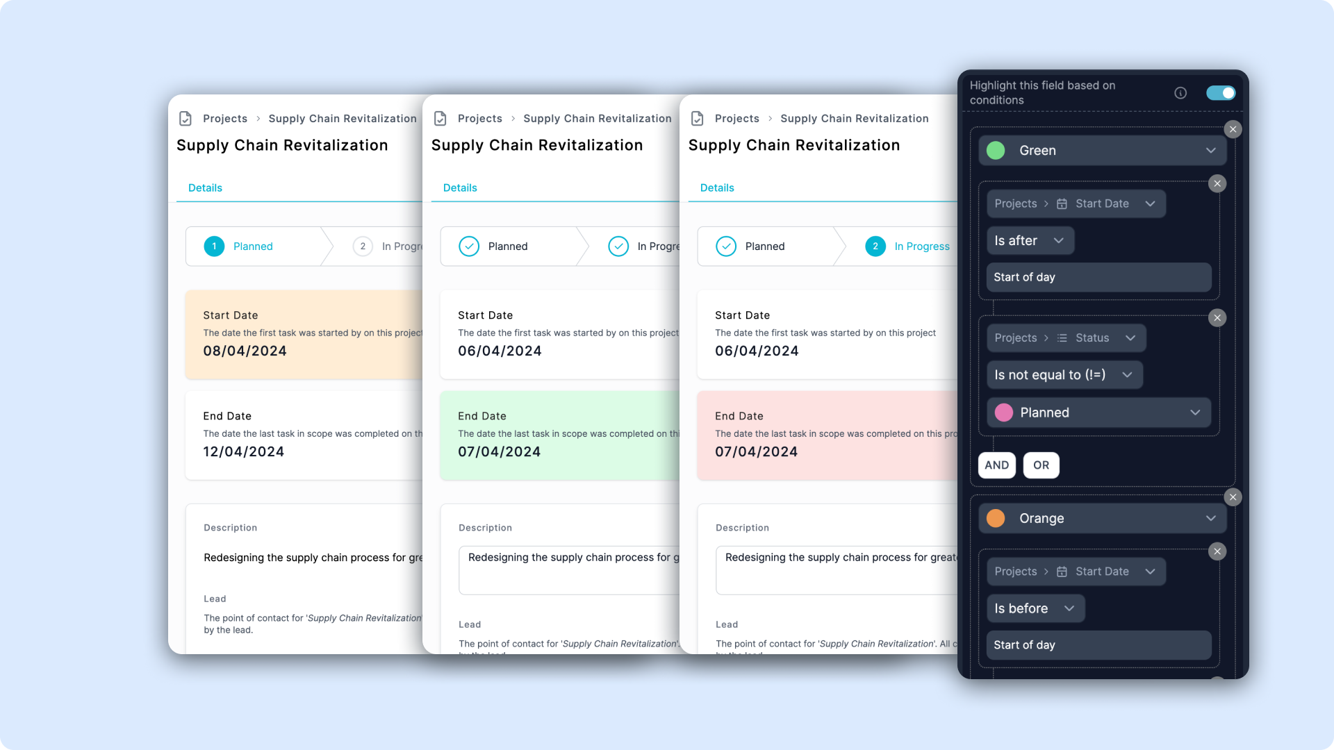 Conditional Highlights can allow you to change the of a field based on various conditions. Such as field values, logged-in user parameters and more.
