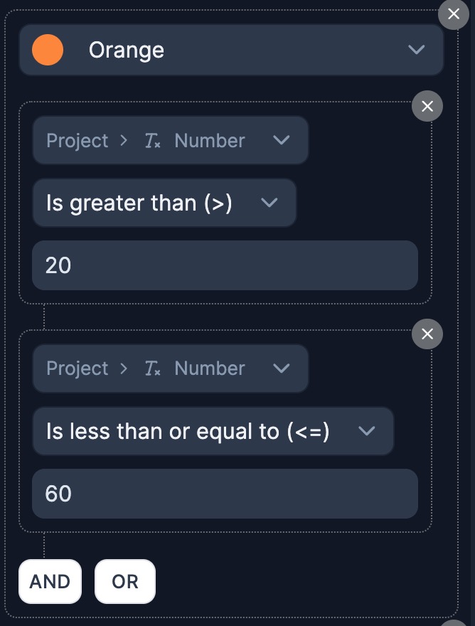 It will turn "Orange" if the field *is greater than* 20 AND *less than or equal to* 60.