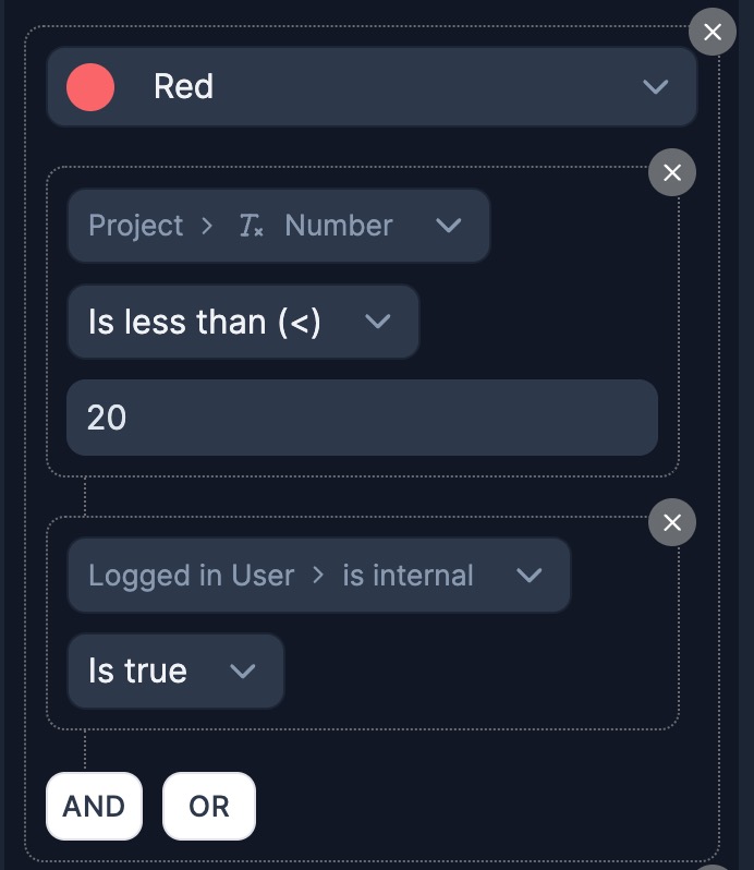 For example, you can change the color of a cell based on a field's value and also the *logged in user's role*. With the below conditions, the cell will only be highlighted *"Red"*, when the value of the "Leads" field *is less than 20* AND the *logged in User is internal*.