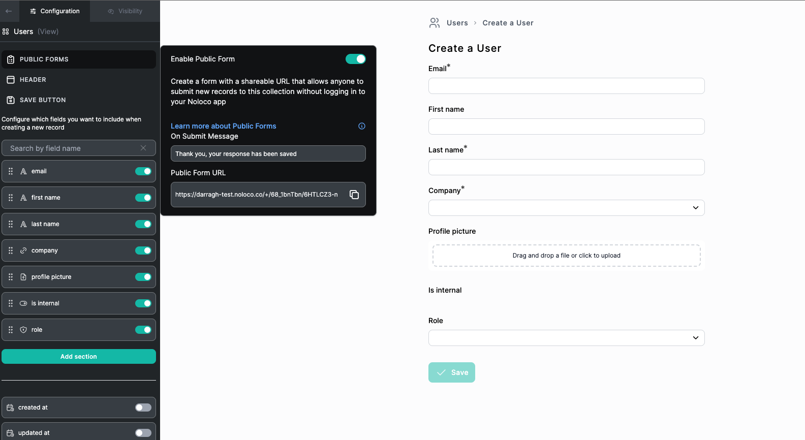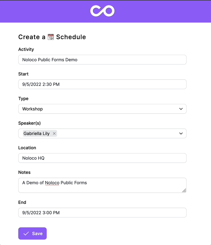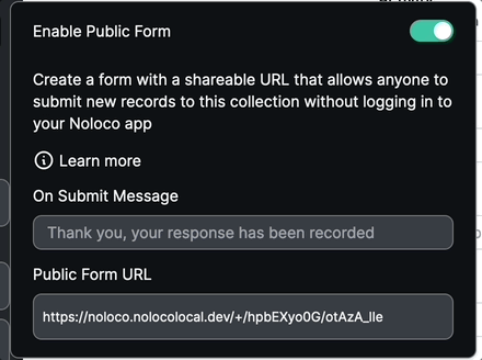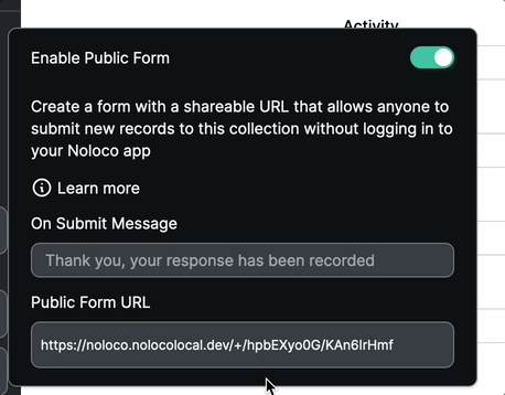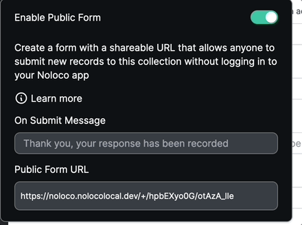 Public Forms allow you to create a web form with a shareable URL that allows anyone to submit new records to a table without logging in to your Noloco app.