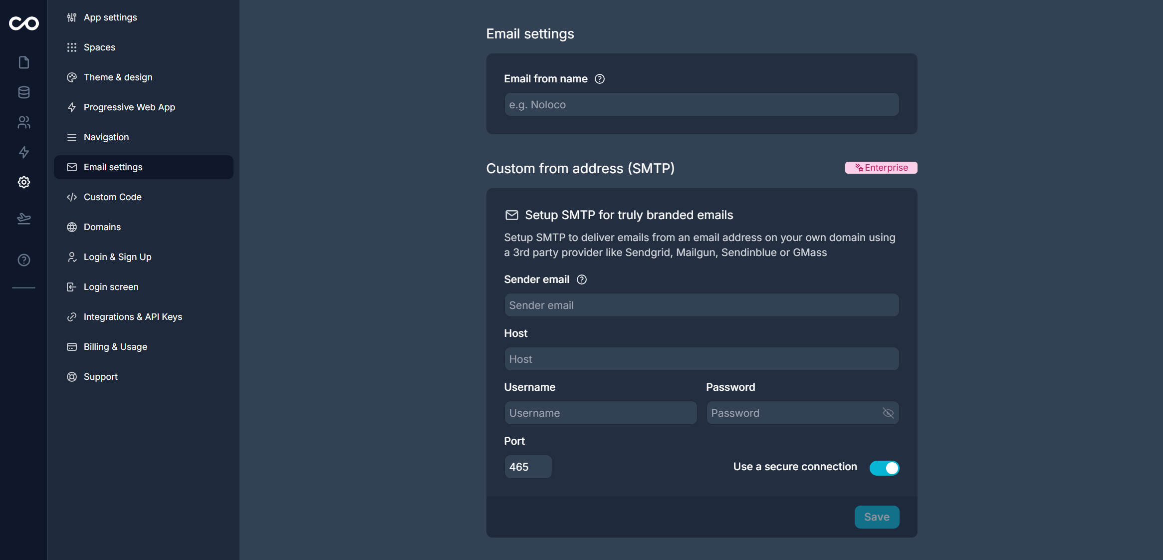 SMTP configuration is only available on [Custom plans](https://noloco.io/pricing). Chat to our team If you want to send emails from a custom email address.