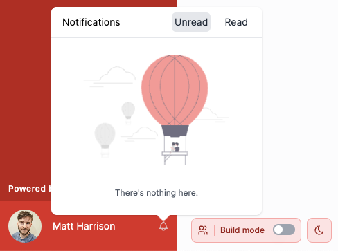 The notification tray is available as a popover in the bottom-left of the app next to your profile. It is available to all users in your app, not just builders.