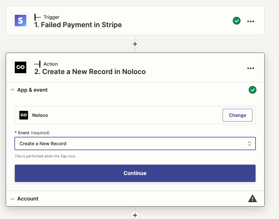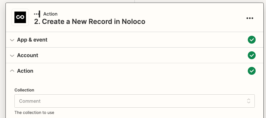 4. Next, choose "Noloco" as the App and choose `Create a New Record` as the Event