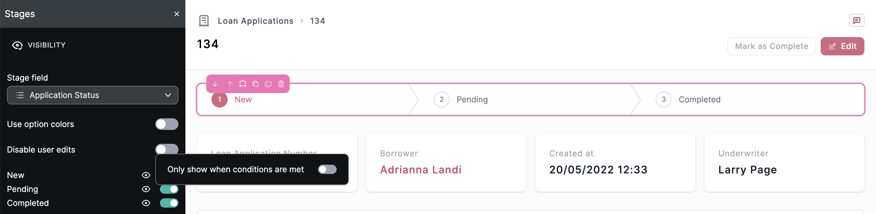 A common use case for this feature is to only show a stage value when certain record fields have been completed to ensure good data hygiene within your app.