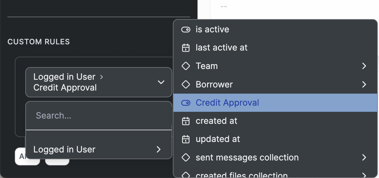 In the above scenario, if the Logged in User attribute you needed existed on the Borrowers User list you must select Logged in User > Borrower > user (from Borrower) > Field Criteria e.g Credit Approval