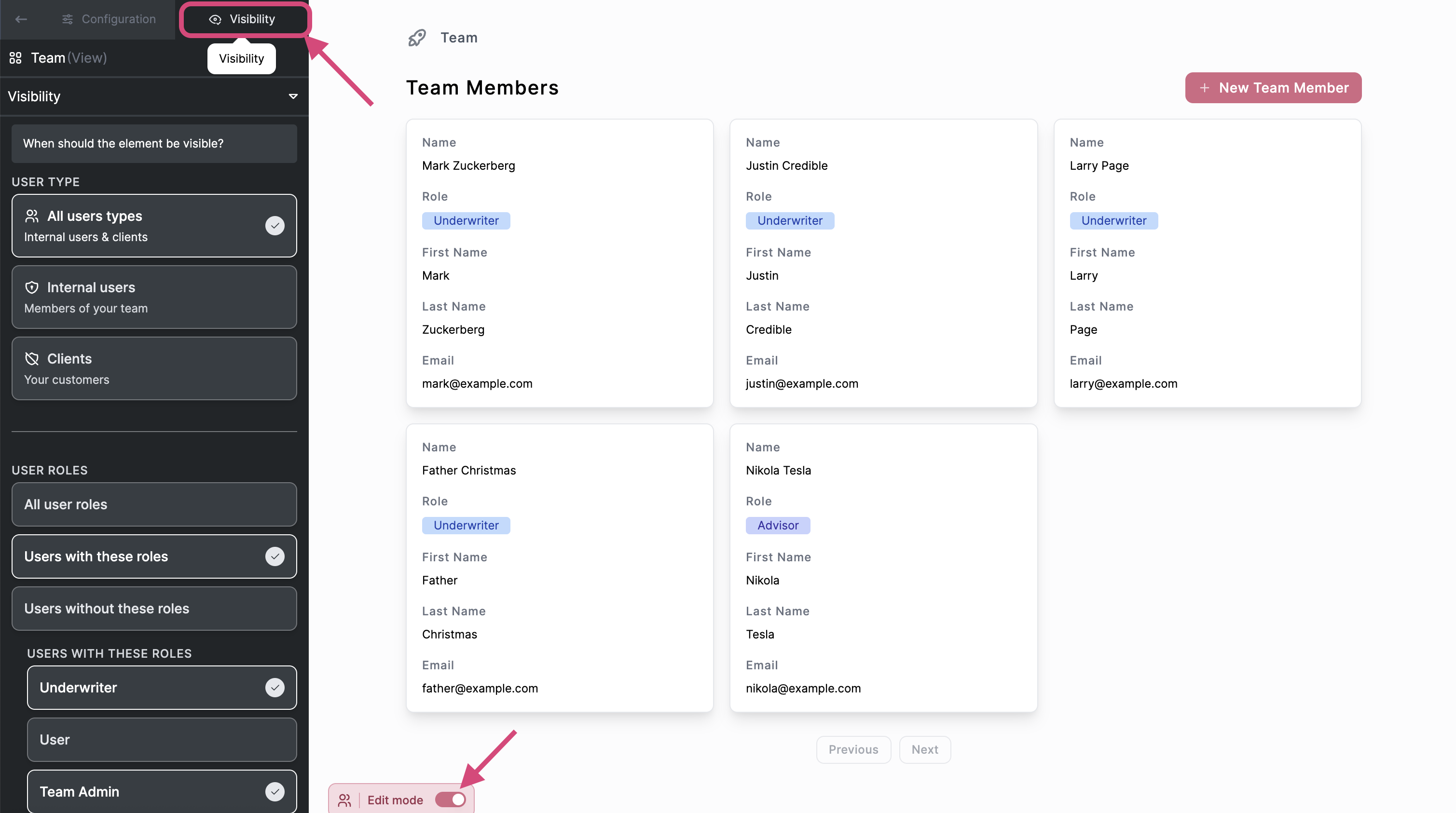You may also show / hide UI elements to specific User Roles that you have setup in you app. By default Noloco creates a Team Admin and User role. You may create additional custom roles if you need to. Learn more about User Roles and Permissions in this guide [here](https://guides.noloco.io/users-and-permissions/user-access)