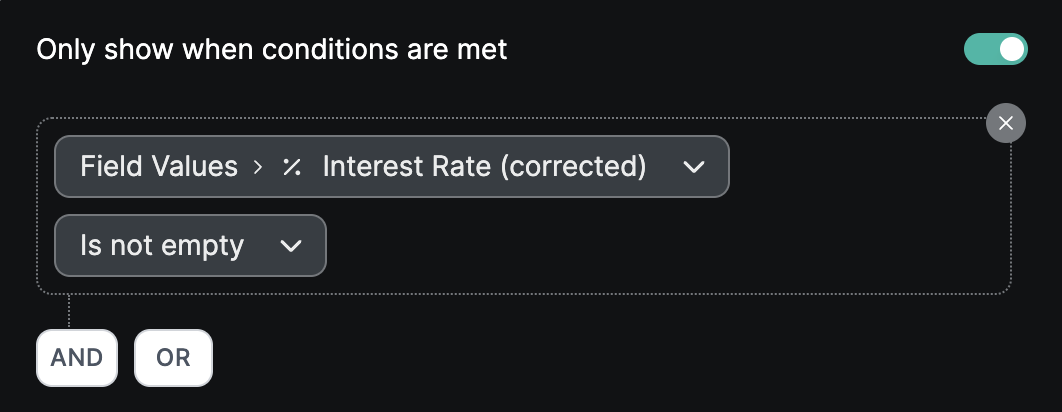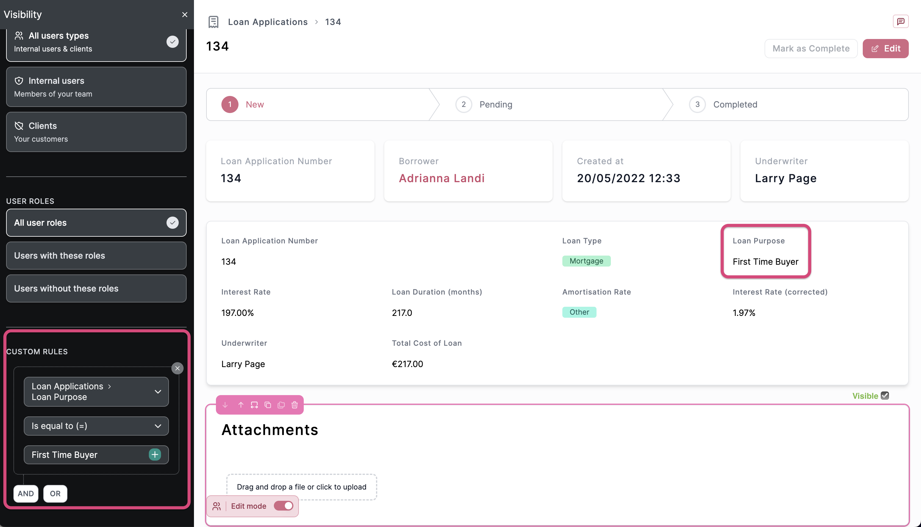 On a record page, you can access the visibility settings for any component on the page. In the below screenshot example, a custom rule was setup to only display the Attachments block if the Loan purpose was 'First Time Buyer'.