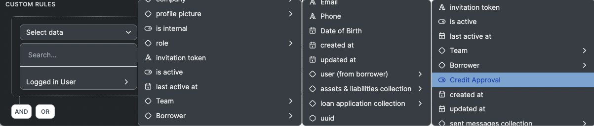 In the above scenario, if the Logged in User attribute you needed existed on the Borrowers User list you must select **Logged in User > Borrower > user (from Borrower) > Field Criteria e.g Credit Approval**