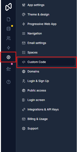 You can find the Custom code section by going to your ***App Settings*** and finding the ***Custom Code*** on the list or by clicking on this link: <https://portals.noloco.io/~/_/settings/custom-code>