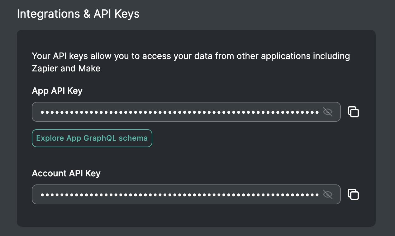 To use [Zapier](https://guides.noloco.io/integrations/zapier) or [Make](https://guides.noloco.io/integrations/make) with Noloco you will need to add both the App API key and the Account API key to Zapier/Make during the connection process.