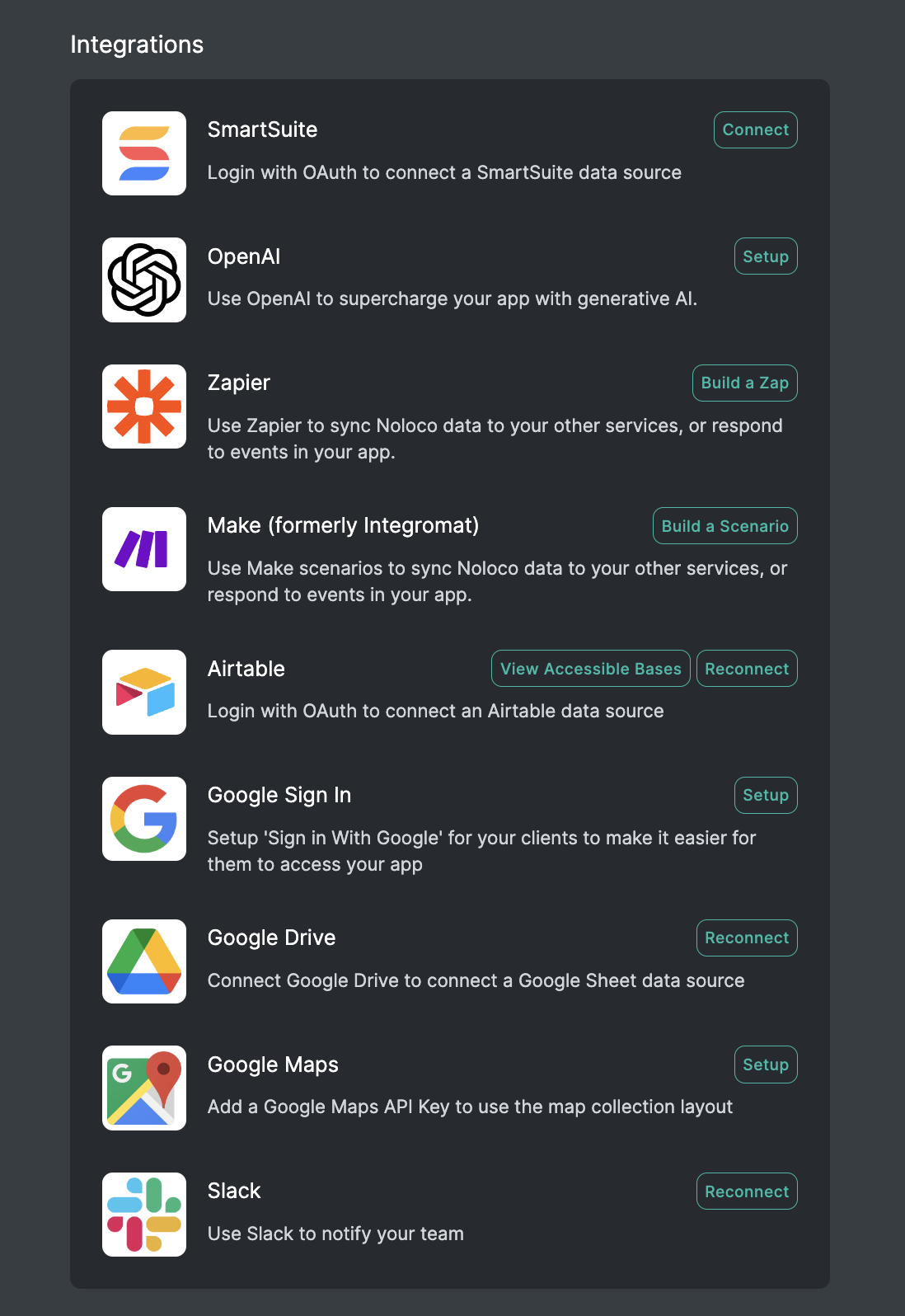 For more information on Noloco's integrations see our Data Sources and Integrations sections