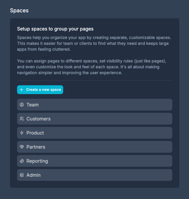 Spaces are accessed and managed from your app’s settings, where admins can create, customize, and adjust Spaces to fit your organizational structure.