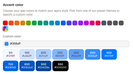 You can choose from one of our 10 default themes which are tuned to beautifully present your data. Or, if you want your app to match your company's brand, you can set a custom color.