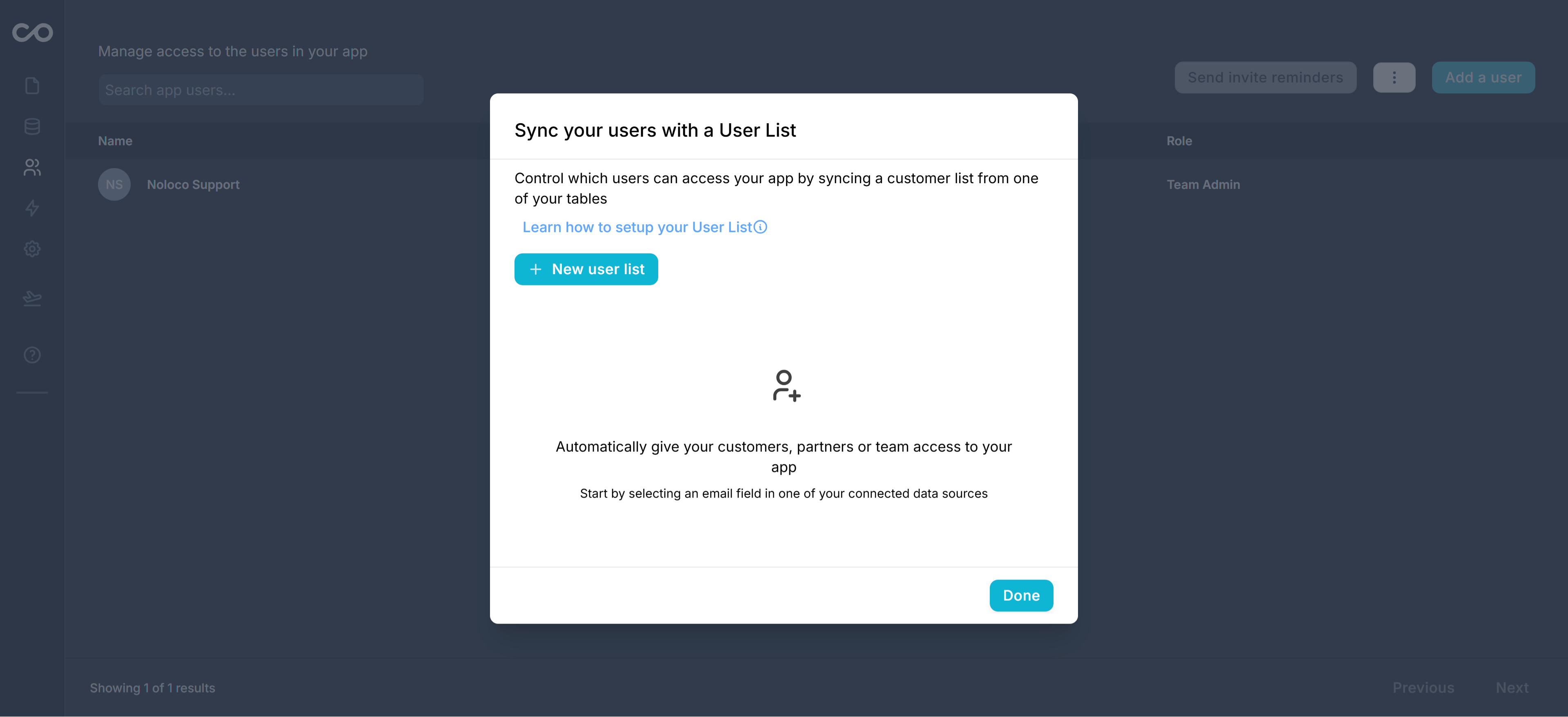 If you already have an Airtable, SmartSuite, or HubSpot table, Google Sheet, or a Postgres/MySQL database with your users' information (first name, last name, email, etc.) and want to continue using this table as the source of truth for your users, you can use our User Lists feature to sync your user data to your Noloco Users table and allow those users to log in to your app.