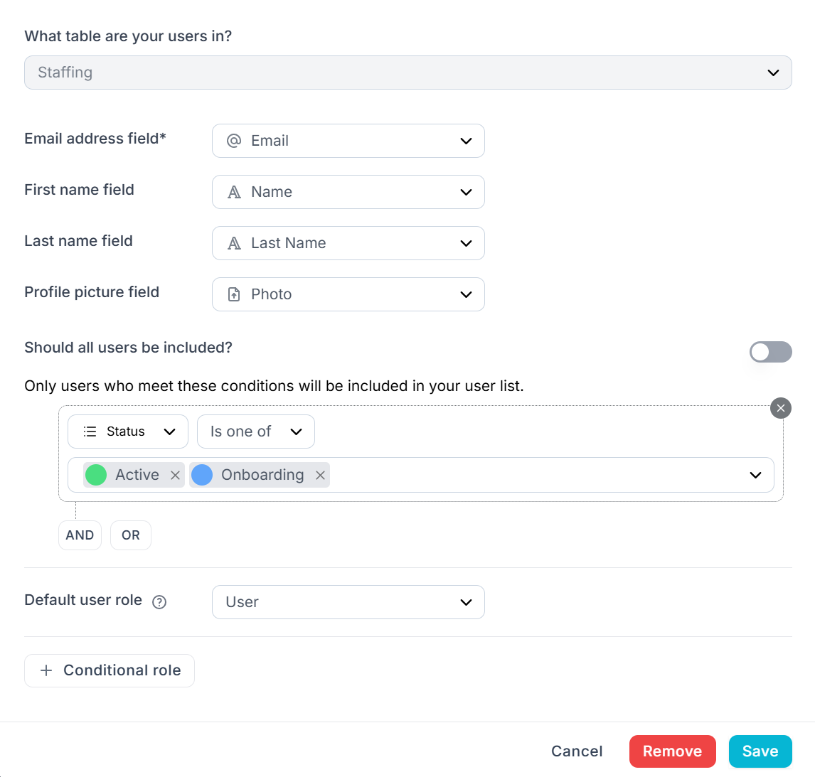 By default, Noloco will import all records on your user list as ***Users***; however, you can change this behaviour by switching off the *"Should all users be included?"* toggle.