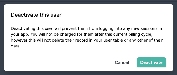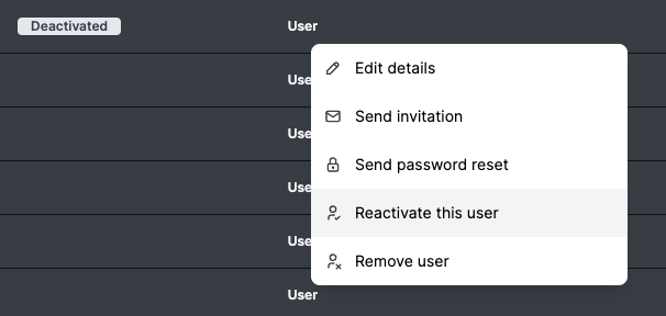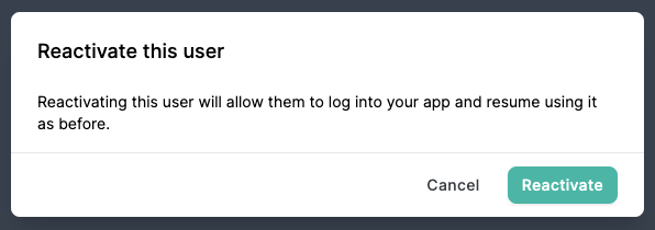 At any point after offboarding a user by deactivating their account you can reactivate them to allow them to use your app again. Simply go back to the same popover on the User Table and this time select "Reactivate this user".