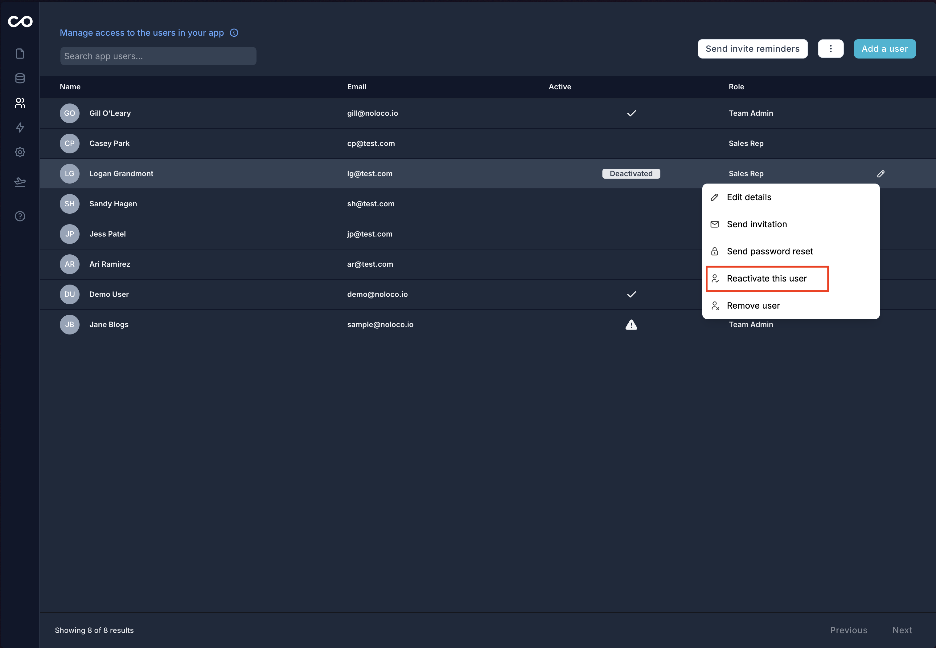 You can reactivate a deactivated user at any time through the User Tab or via a [Workflow](https://guides.noloco.io/workflows/workflows/reactivate-a-user-action). Reactivating a user will allow them to log into your app and resume using it as before.