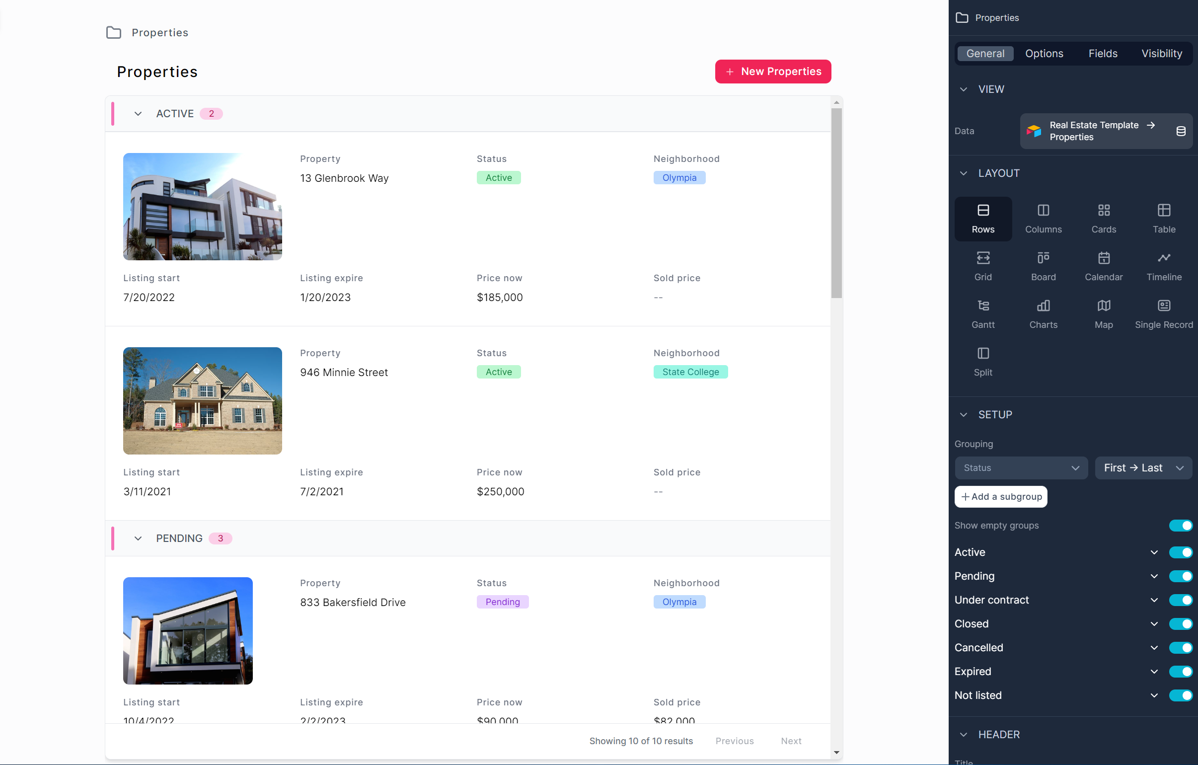 To access the Display options you must first navigate to the table you wish to format from the menu sidebar. In our sample Real Estate Noloco app, we are going to try out a new display option for the 'Properties' table.