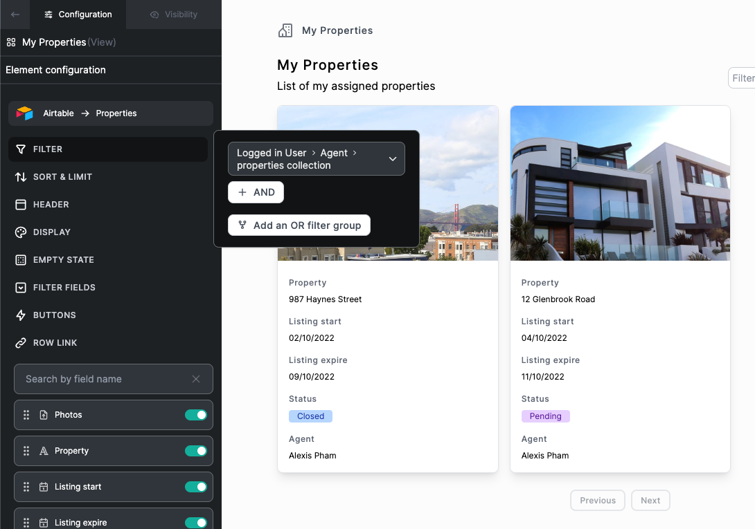 In the below example we are applying a filter on the Properties table. We only want to show the logged in user (or Estate Agent in this case) their assigned Properties.